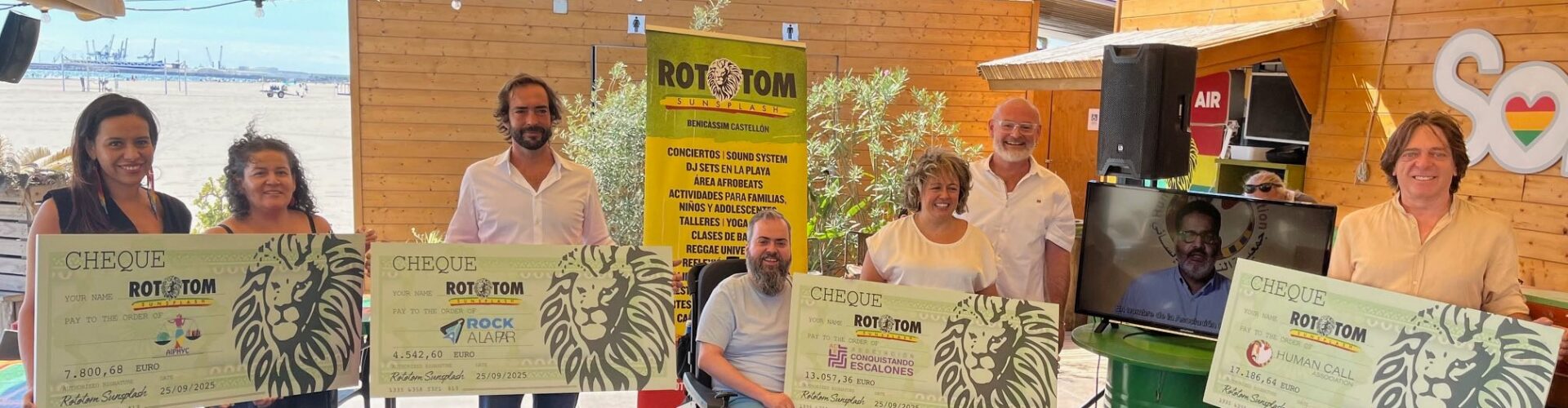 El festival internacional reggae Rototom Sunsplash ha hecho entrega este jueves, en un acto celebrado en Solé Rototom Reggae Beach, de los 42.587,28 euros recaudados en la iniciativa solidaria impulsada por la Fundación Exodus en su 30ª edición, celebrada en agosto en Benicàssim, que ayudarán a financiar cuatro proyectos sociales de las ONG Human Call (Líbano), A la Par (Madrid), la valenciana AIPHYC y la vila-realense Conquistando Escalones.